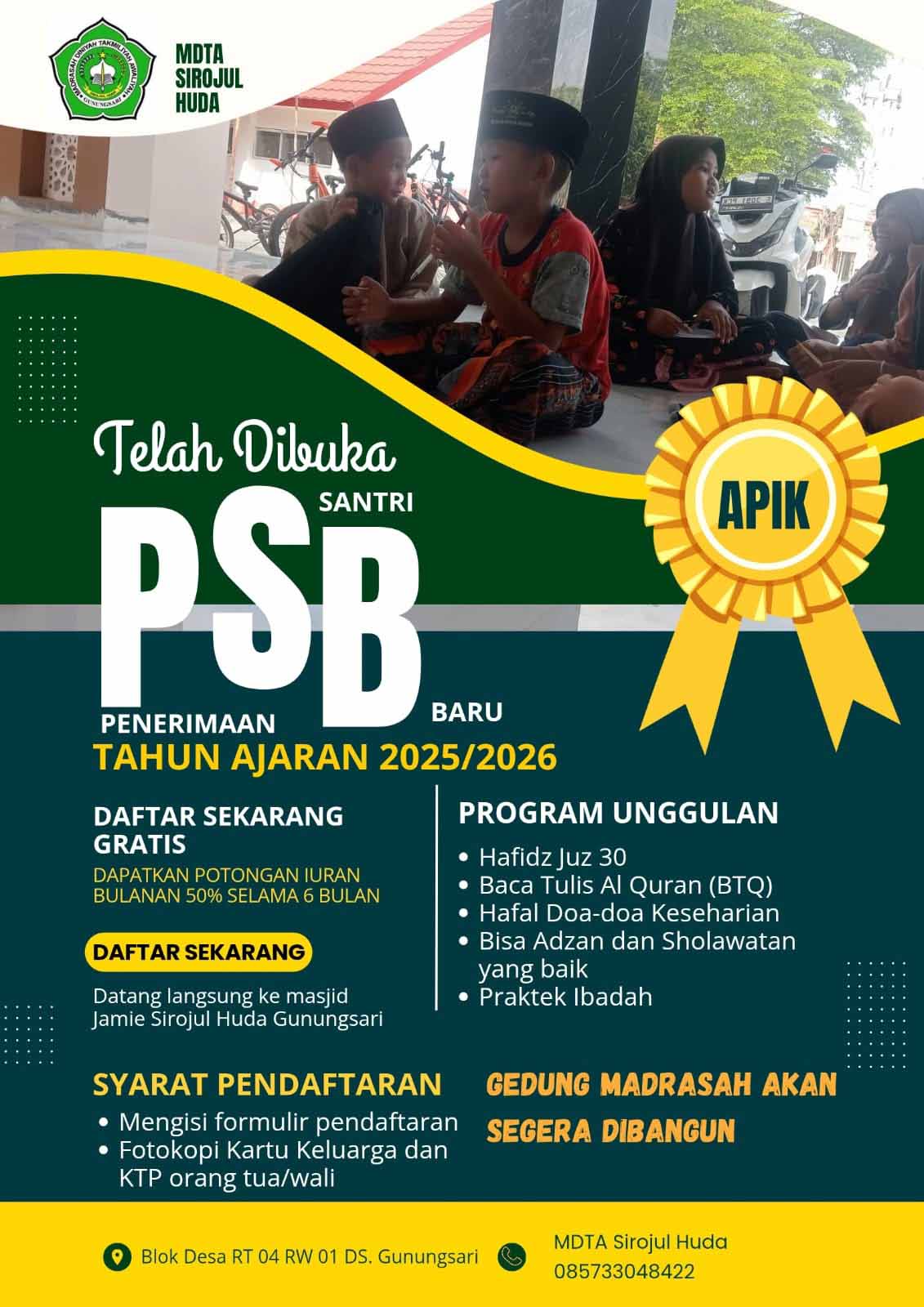 Gunungsari, Indramayu,15/08/2025 # Pendidikan agama adalah pondasi penting bagi anak-anak untuk tumbuh menjadi pribadi yang berakhlak, berilmu, dan bertanggung jawab. Memahami hal itu, Yayasan Sirojul Huda Gunungsari membuka pendaftaran siswa-siswi baru Madrasah Diniyah Takmiliyah Awaliyah (MDTA) untuk tahun ajaran 2025/2026, mulai 10 Agustus hingga 30 September 2025.