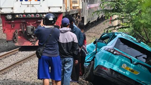 - KRL berhenti akibat insiden dengan taksi listrik di perlintasan tanpa palang pintu.
