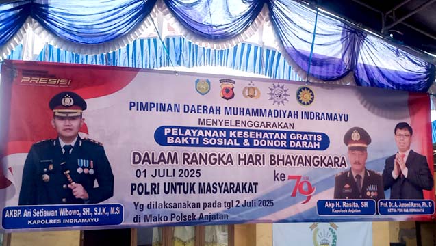 Indramayu, 2 Juli 2025 # Dalam rangka memperingati Hari Ulang Tahun Bhayangkara ke-79 yang jatuh pada 1 Juli 2025, Pimpinan Daerah Muhammadiyah (PDM) Indramayu bersama Rumah Sakit Islam Zam-Zam Muhammadiyah Jatibarang, Polsek Anjatan, dan Dinas Kesehatan Kabupaten Indramayu menyelenggarakan kegiatan pelayanan kesehatan gratis, donor darah, dan bakti sosial di halaman Mako Polsek Anjatan.